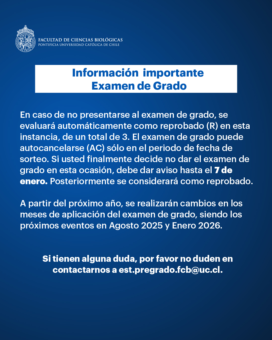 Noticias Información importante Examen de Grado Miércoles 20 Noviembre 2024 Noticia Anterior Siguente Noticia