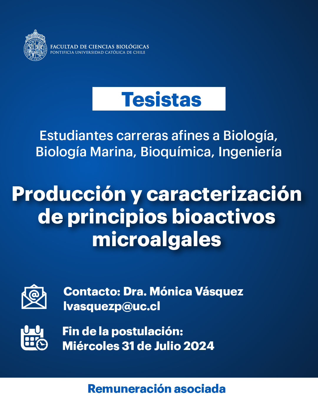 Noticias Aviso Tesistas: Estudiantes carreras afines a Biología, Biología Marina, Bioquímica, Ingeniería Martes 09 Julio 2024 Noticia Anterior Siguente Noticia